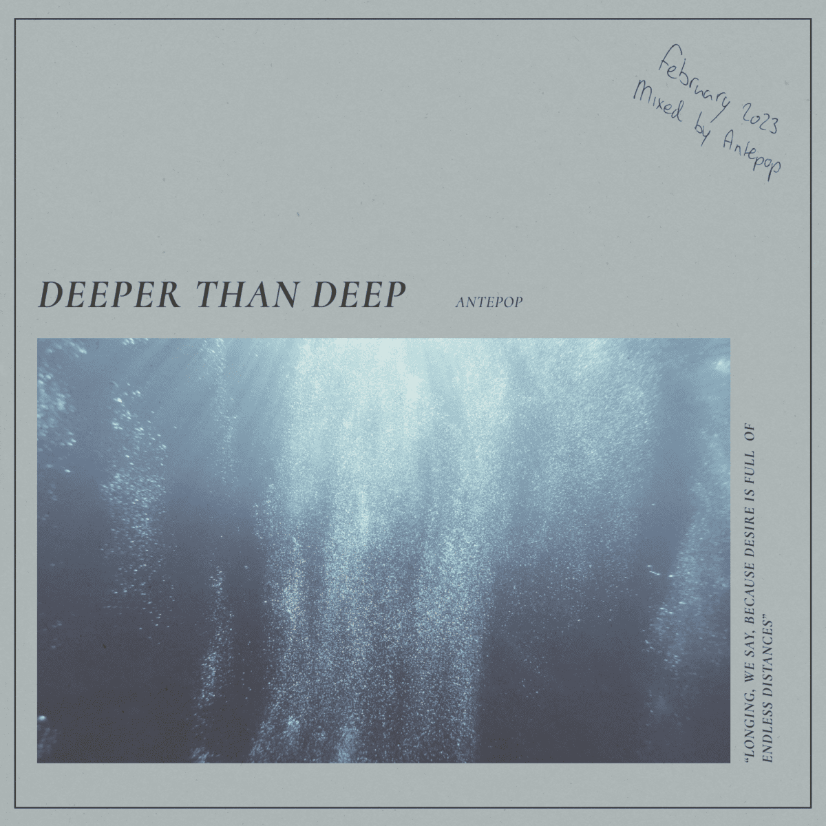 “This is a quintessential deeper than deep vinyl mix from me featuring tracks from artists that I admire. I’d like to think that this mix would be best enjoyed deep underwater, in The Mariana Trench perhaps, music for deep sea explorations.”