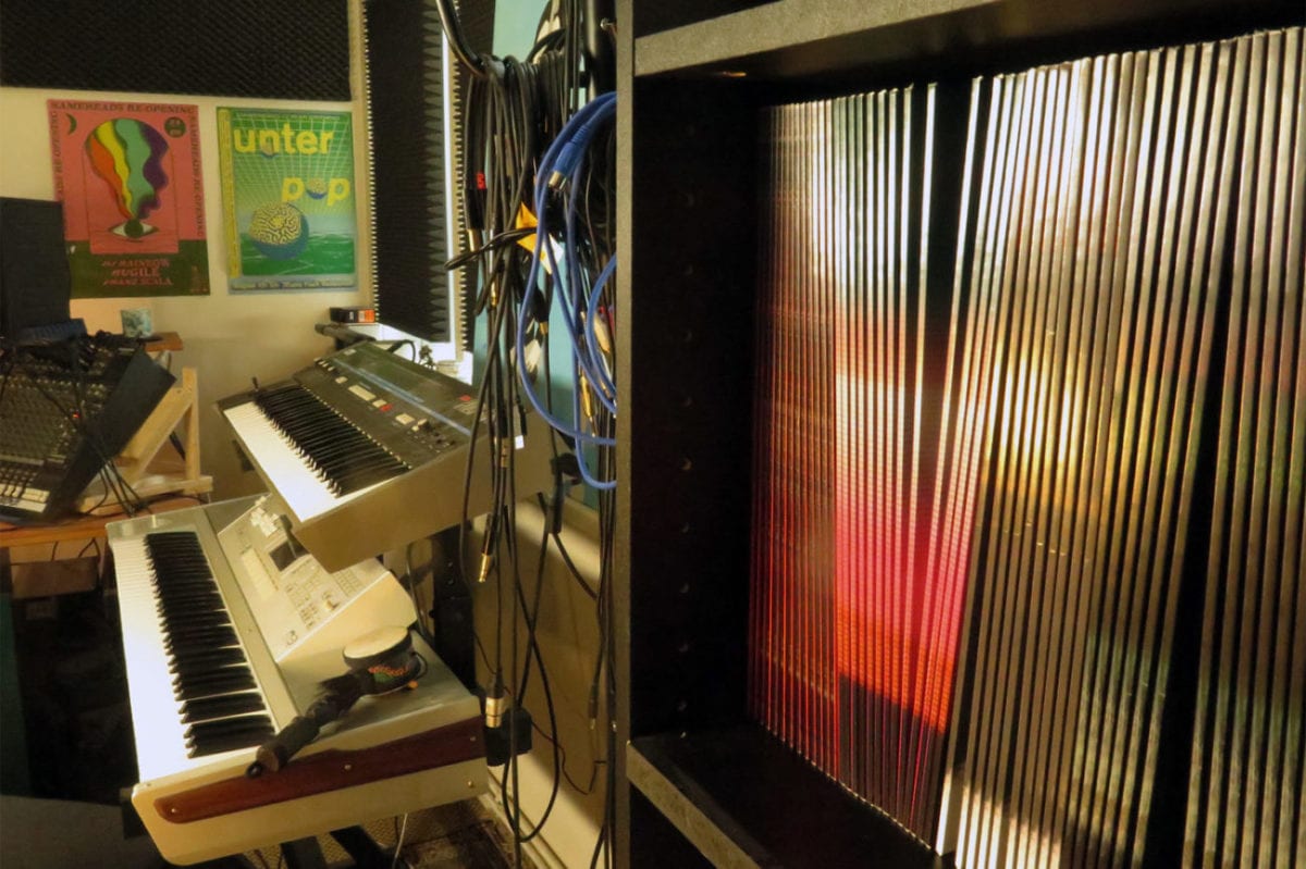 This is a pice of art from my Wife, she made it after coming back from Australia. For me it is like a portrait of Aborigine robots getting together. I like to hang out in the studio and listen to all of the records that I brought with me to Berlin and all of my records from the 80’s and the back catalogue of my record labels. I like to be in a comfy and cozy studio with just the machines, this artwork makes the space less cold and more like home.