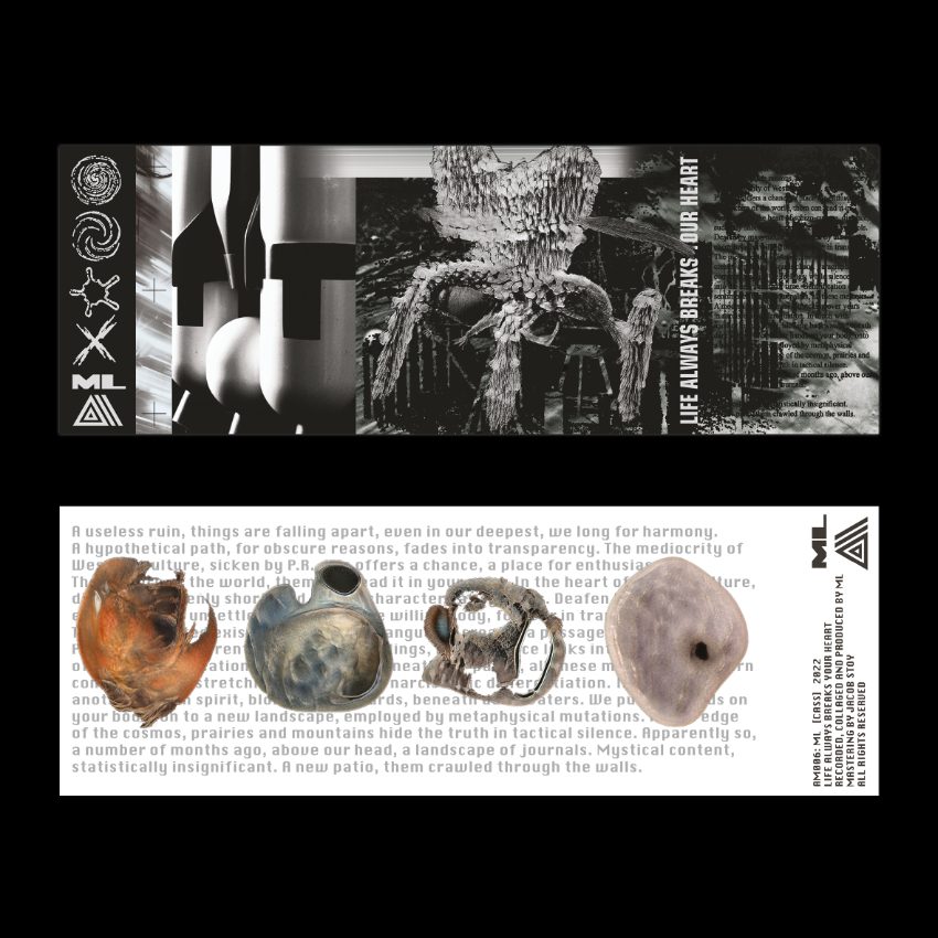 ML’s piece, ‘Life Always Breaks Your Heart‘ is split into two parts, ‘Sooner‘ and ‘Later‘, with each consisting of endless sound pieces that journey ever downwards into the sonic identity of the artist, spliced with touched vocal samples relaying stern topics and bizarre stories, momentary field recordings that linger at the edge of hearing, and sparse but decisive production.