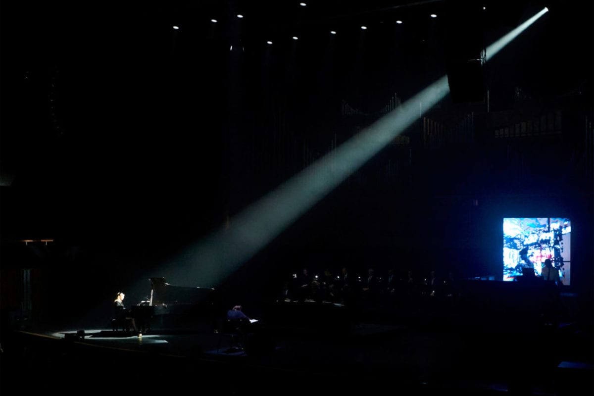 Very, very gently, Monell’s fingers grace the keys for the first time. Her music is febrile and she is full of expression in the gentle arpeggios, rocking back on the stool in passion as the spotlight warms her. The lights remain pallid but warm a little into a blush of pink, and a pattering of synthetic rain pours from the hardware stage right.