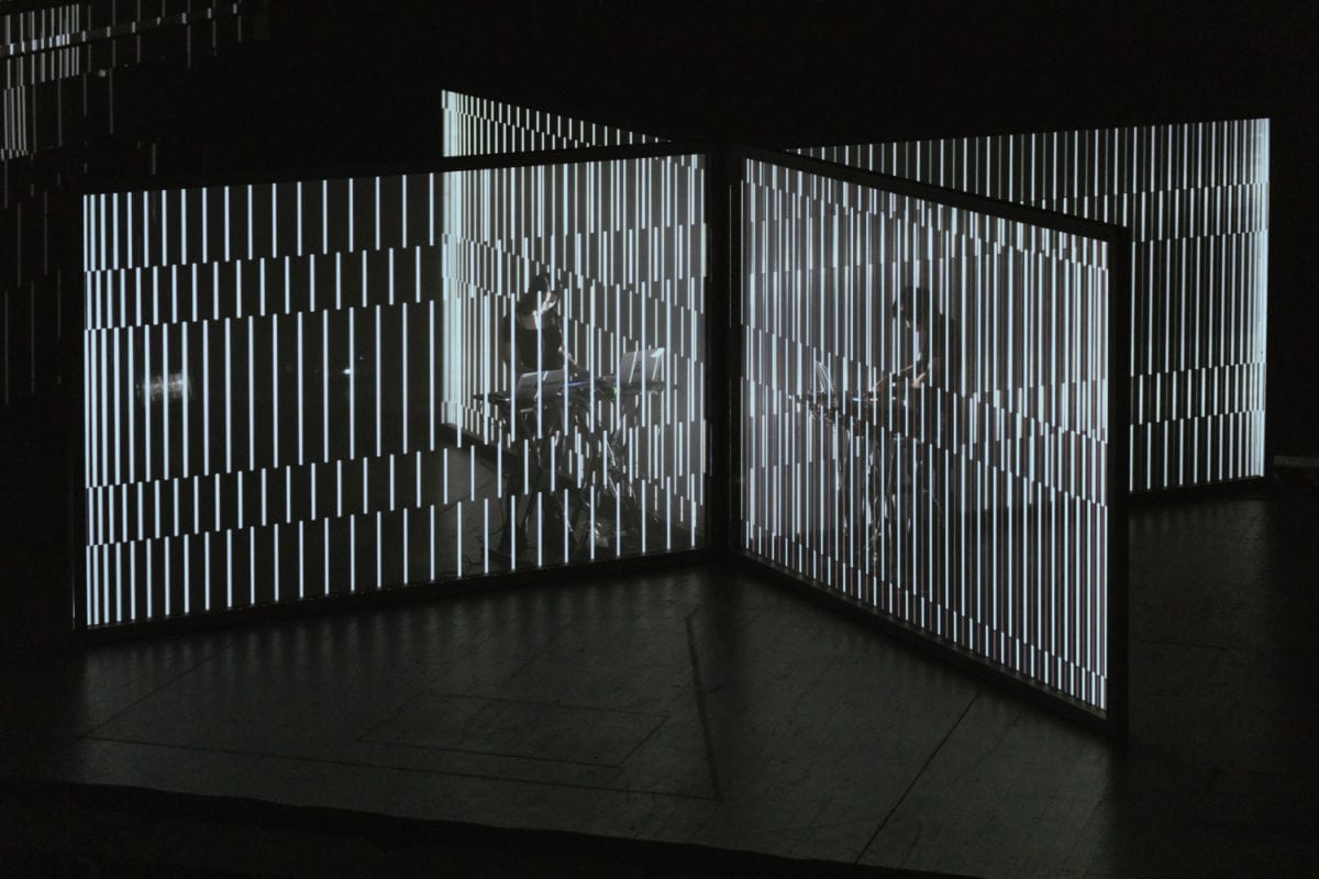 As we file in, hand sanitiser stinging our ethanol-drunk skin, an enigmatic sight awaits: A cross-grid of black metal, the beams shrouded in white mesh, and opposing electronics, set up facing one another and separated by the mesh.
