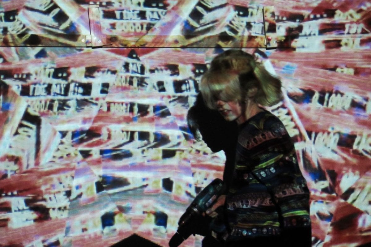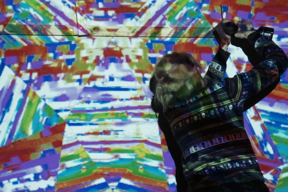 In the main room is my live visuals project. A lot of it is databent – treating video as raw data and applying audio effects to it, which produces all kinds of psychedelic, rhythmic imagery.