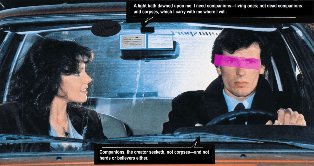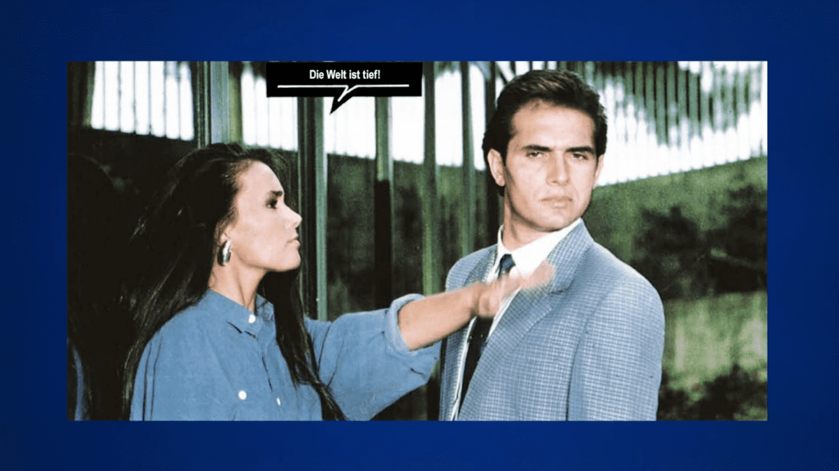 “This video was made by Eluard himself, showing how he can easily juggle his two biggest passions: music and video making. All the images shown in the video are cuts from Italian photo novels made between 1979 – 1983, while the texts are excerpts from “Thus Spoke Zarathustra” by Nietzsche. The video’s inspiration can confidently be traced to the Italian TV commercials. The technique used in its realisation is a collage using a small portion of a TV screen filmed with a camera as a background.” – Eluard
