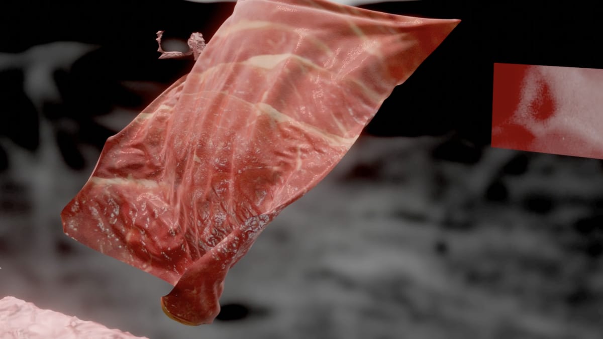 “In an audiovisual exercise of speculative world-making, trans-disciplinary artists GOLPESAR and she.PHASE execute a simple intervention : a breach in the skin to allow the world to enter the body. The result is an architecture of humble meat, a familiar topography of flesh from within which the viewer is individuated. The world, finally stripped from its surface layer, spills out its guts in an appetising aesthetic display of rendered fake-meatTM viscosities where bodies, spaces, and objects do not belong to, but rather constitute the very limits of the world.