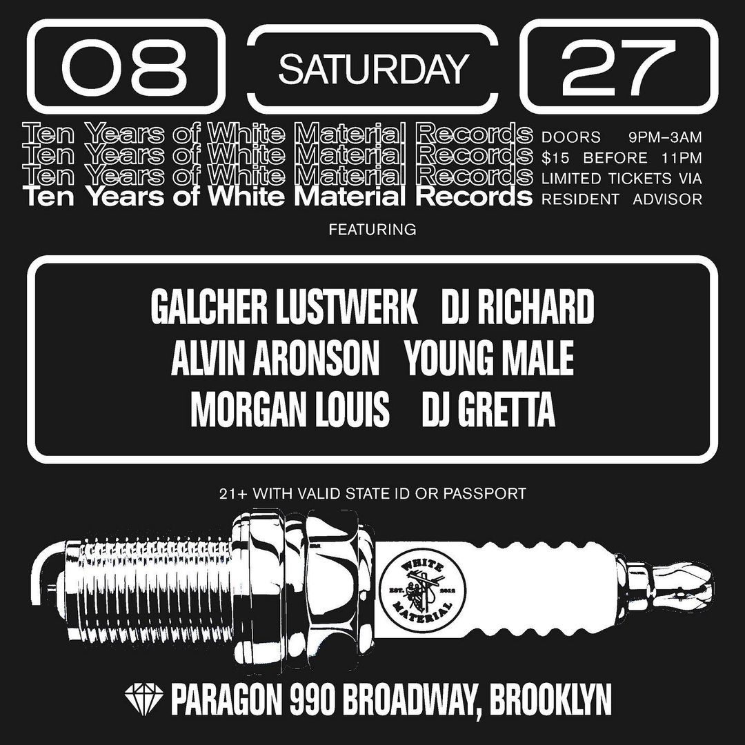 White Material, the iconic New York-based DIY imprint co-founded in 2012 by Young Male and DJ Richard, are set to celebrate their 10 Year Anniversary in Brooklyn on Saturday 27 August.